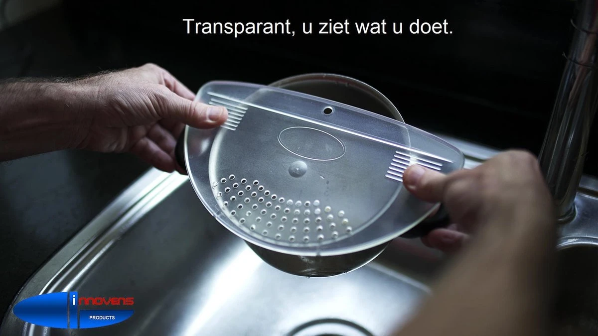 Schuif de Afgieter® eenvoudig over de pan, in de richting van de handvatten. De opstaande ‘rand-haken’ waarborgen een stevige fixatie met de rand van de pan, ongeacht het formaat van de pan.