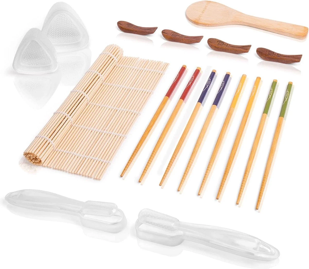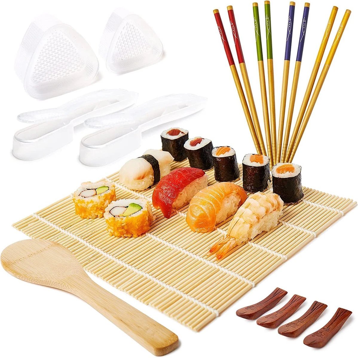 - Kwaliteit en veiligheid: de in de sushi-set aanwezige rolmat, de eetstokjes met de bijbehorende planken en de rijstlepel bestaan allemaal uit kwalitatief hoogwaardig bamboe en zorgen daardoor voor een aangenaam en veilig gebruik voor iedereen, of het nu klein of groot is.