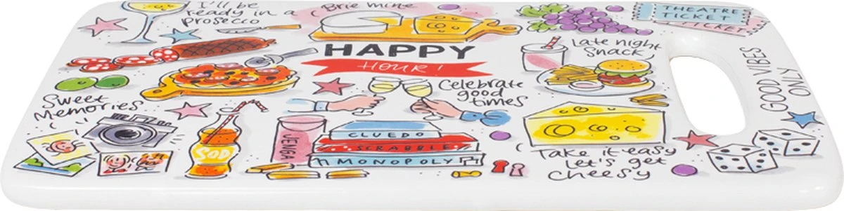 This make me happy! Deze vrolijke kaasplank, maakt jouw tafel nog gezelliger! De opvallende en kleurrijke illustraties zijn in het thema Happy ontworpen. Op de kaasplank staan allemaal grappige quotes die jou blij maken. De kaasplank is leuk te combineren met de andere nieuwe Happy items.