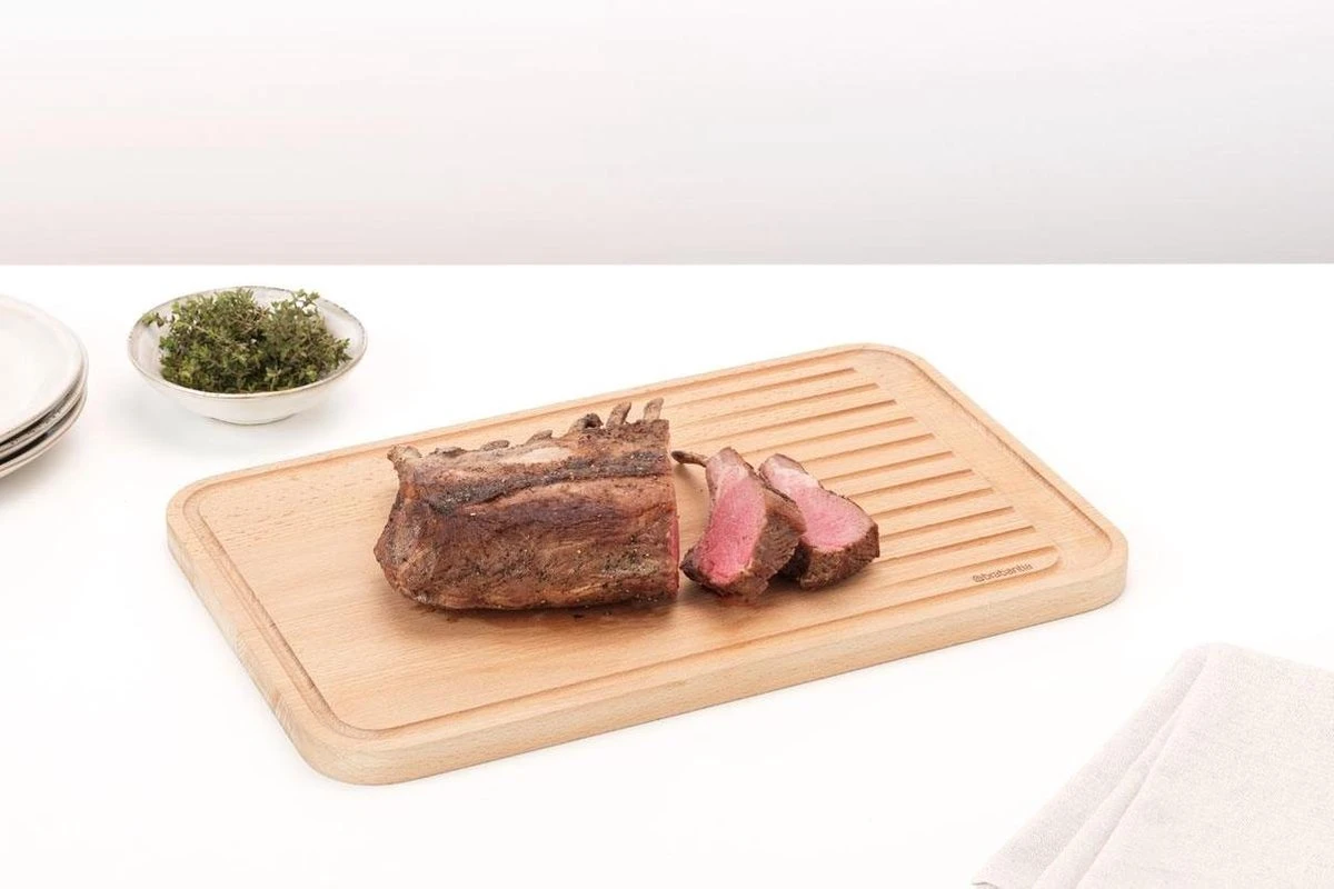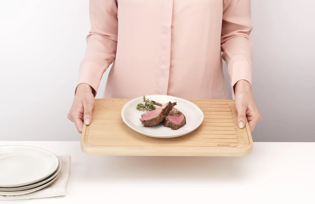 Deze stijlvolle en duurzame houten Brabantia Profile snijplank is gemaakt voor het snijden van vlees. De groeven vangen de sappen op, dus geen geknoei. Klaar met snijden? Gebruik de achterkant om te serveren.