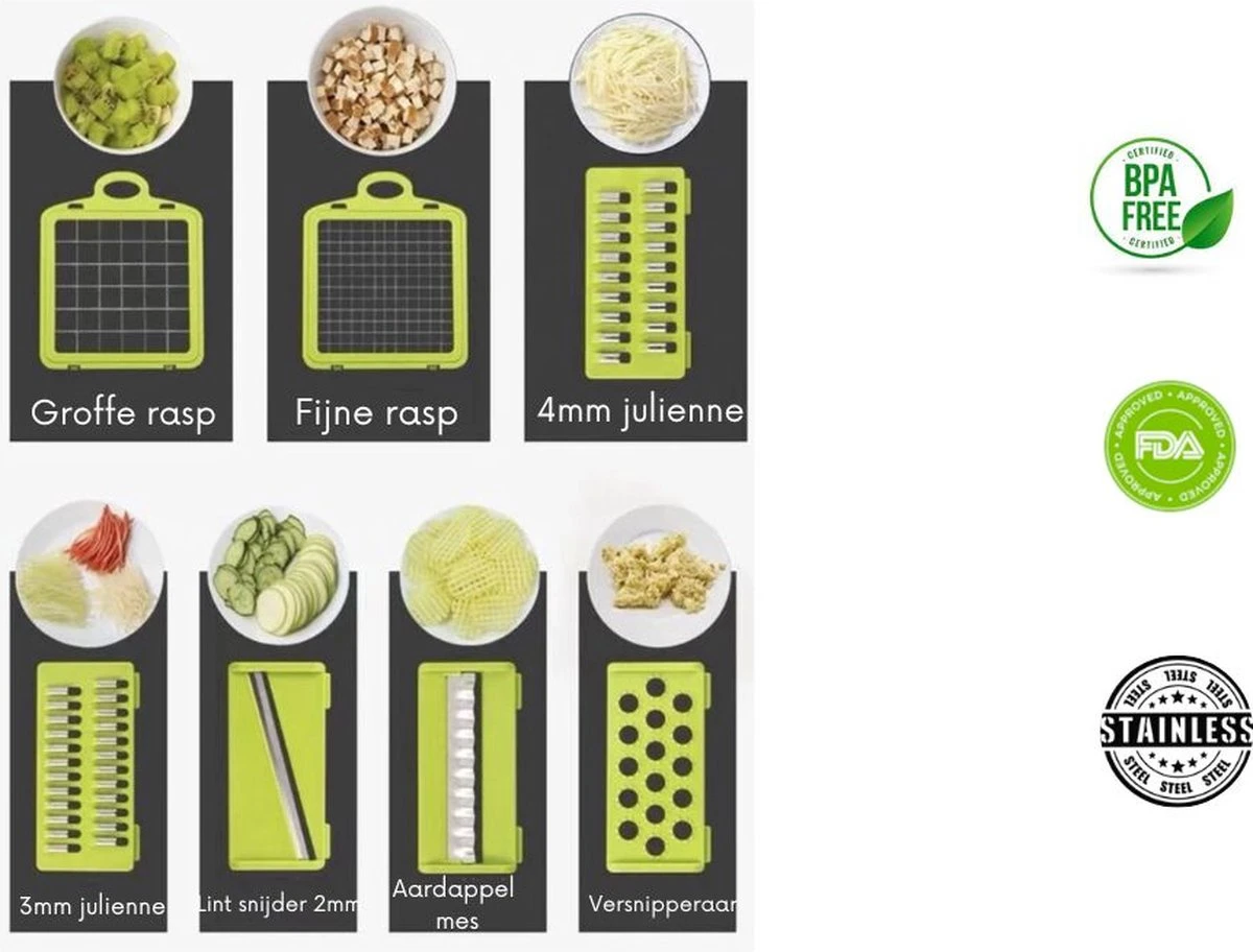 Gemaakt van vlijmscherp RVS staal en oersterk kunststof. Hierdoor gaat jouw mandoline een leven lang mee. En snij je eenvoudig zelfs de hardste groenten of fruit in blokjes. Geschikt voor aardappelen, uien, courgette, tomaten en meer.