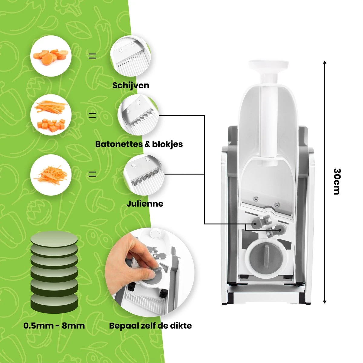 Waarom moeilijk doen als het ook makkelijk kan? Met de groentesnijder snij je veel sneller en veel veiliger groenten in verschillende vormen: blokjes, reepjes, julliene of schijfjes. Bovendien kan je de snijdikte zelf instellen tussen de 0.5 en 8 mm. Zo verkrijg je met de groentesnijder flinterdunne plakjes aardappel voor heerlijk zelfgemaakte chips, of snij je wortel in kleine blokjes voor een heerlijke soep.