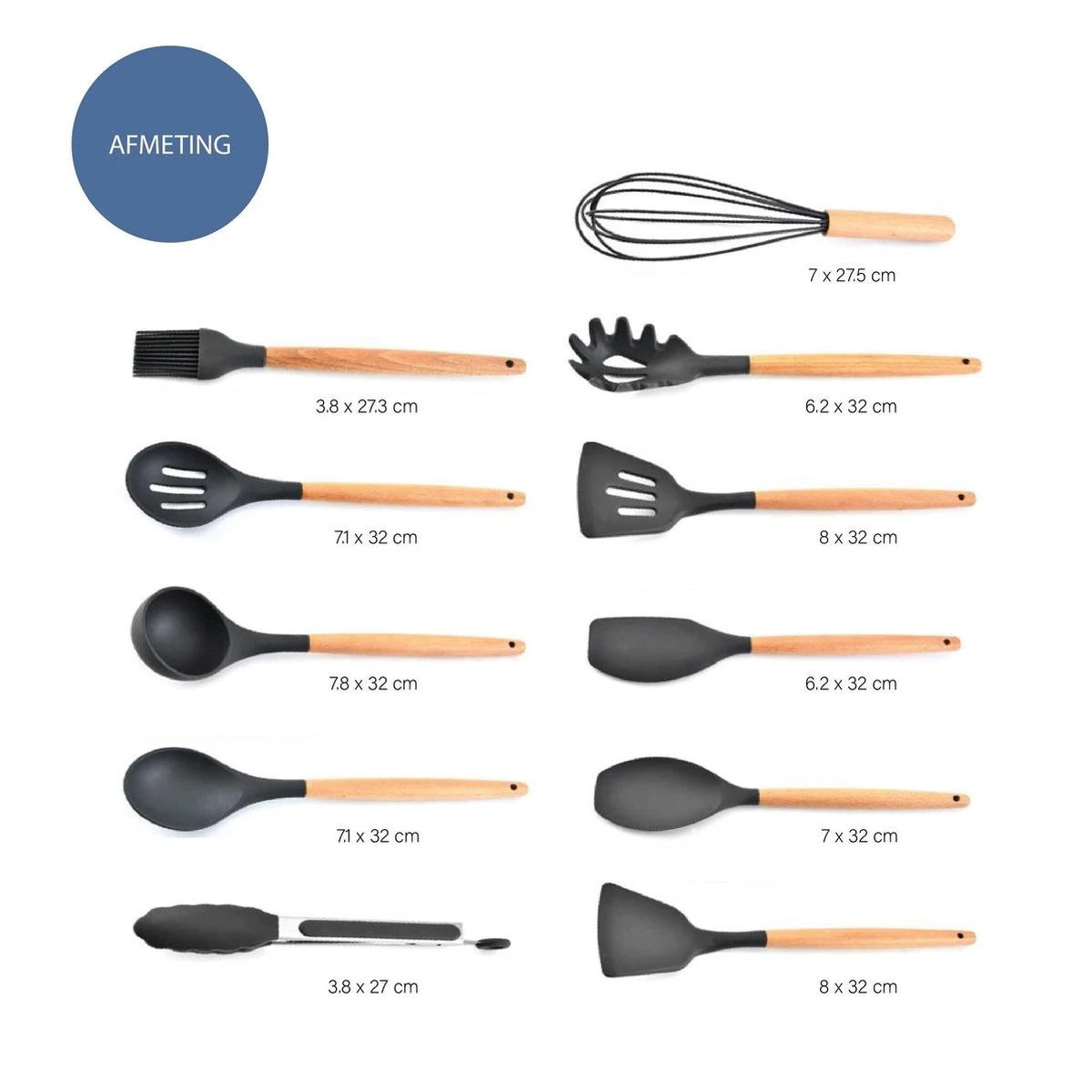 Krumble Siliconen kookgerei 11-delige set / Ophangbare set / BPA vrij / Houten steel – Grijs
