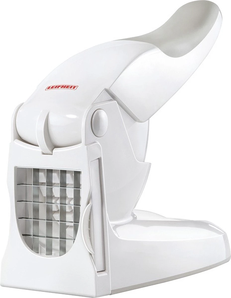 Krokante groente- en aardappelsticks, een highlight bij ieder gerecht! Bereid in de oven zijn ze bovendien gezond en lekker. Deze patat- en groentesnijder van Leifheit snijdt aardappelen en groente in mooie reepjes – zelfs in twee verschillende formaten. Met de twee verwisselbare snij-inzetten snijd je bliksemsnel reepjes van 10 of 12 mm. Een bakblik vol heerlijke rozemarijn-aardappelsticks of krokante, verse patat – het is allemaal zó klaar. Supersnel maak je een lekkere salade van julienne gesneden komkommer, wortel of koolrabi. En met vers gesneden groentesticks, om te dippen of voor bij de BBQ worden ook kinderen groentefans. Eenvoudig in gebruik. De messen zijn voorzien van een kunststof rand en kunnen heel eenvoudig en veilig verwisseld worden. De ergonomische handgreep met antislip softtouch-zone ligt stevig in de hand. De onderkant van de snijder is voorzien van een antislipcoating, waardoor hij stevig staat en niet wegglijdt tijdens het snijden. De messen kunnen na gebruik gewoon onder de kraan schoongemaakt worden. De snijder zelf mag in de vaatwasser.