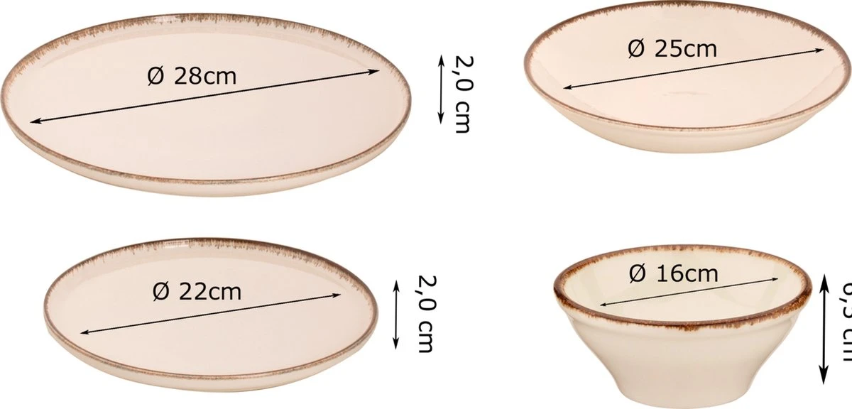 · Inhoud set: 6 dinerborden 28 cm, 6 ontbijtborden 20 cm, 6 diepe borden 25 cm, 6 schalen 16 cm