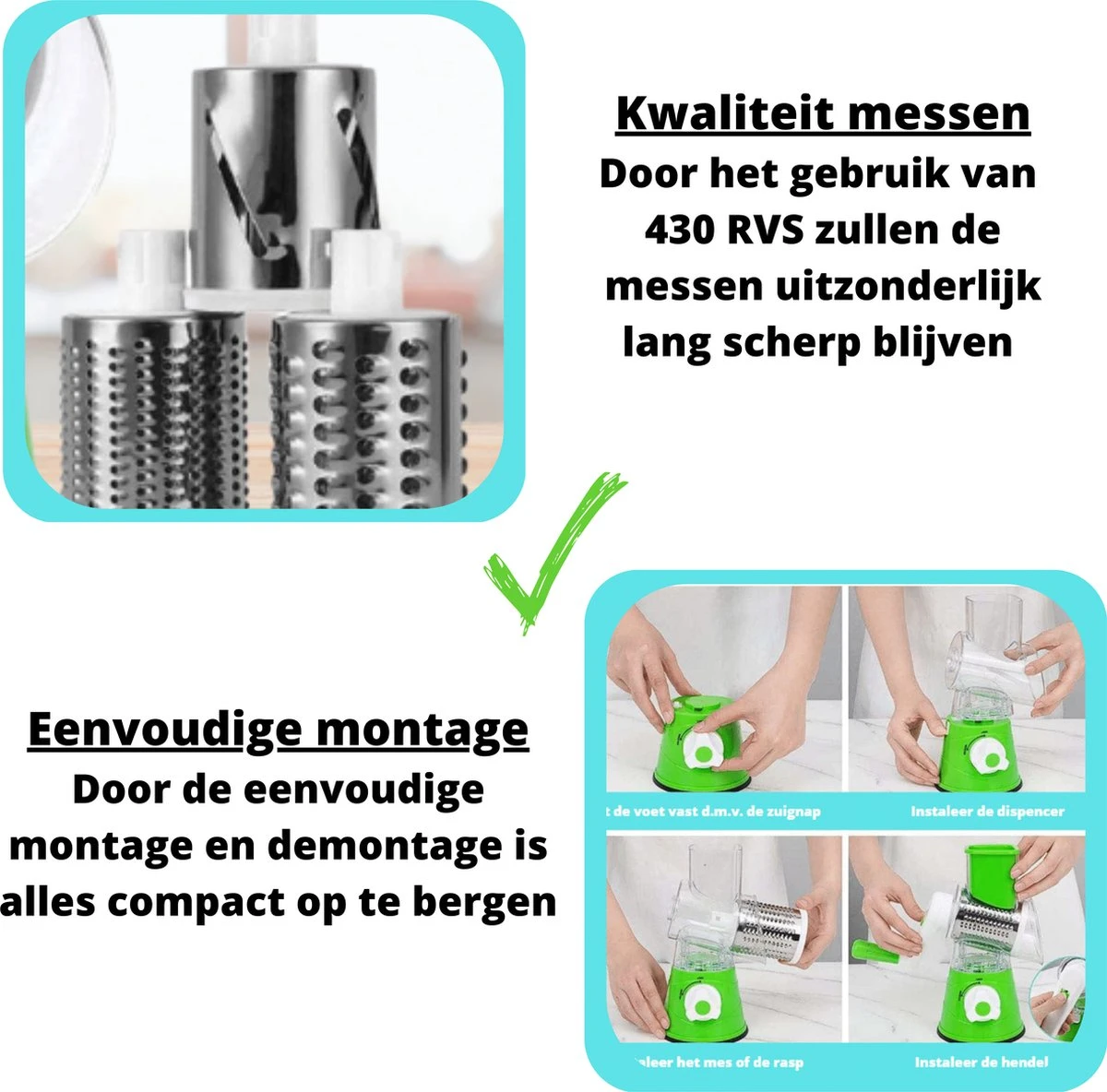 Wil je tijd besparen met voorbereiden van je eten? Met deze 3 in 1 spiraalsnijder heb je de perfecte tool in huis om gemakkelijke groente en fruit te snijden, raspen en versnipperen. Hij zorgt ervoor dat je al je fruit en groente of ander voedsel kan snijden in een snelle en zeer veilig manier. Deze mandoline is gemakkelijk weer op te bergen en is makkelijk schoon te maken. Dankzij de speciale opzetstukken kan je zelfs noten en kaas gemakkelijk raspen en versnipperen.