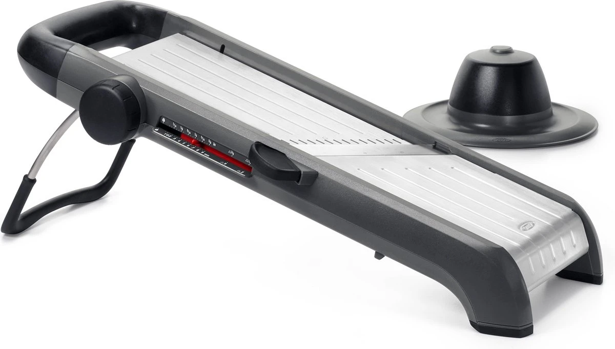OXO Good Grips Mandoline Chef 2.0. Deze mandoline Chef 2.0 van OXO Good Grips is de perfecte keukenhulp voor het snel en gemakkelijk creëren van allerlei culinaire sensaties. De mandoline biedt maar liefst 21 verschillende snij-keuzes: recht, gegolfd, wafel, frites en Juliënnestrips en 17 verschillende snijdikten. Van 1 tot 9 millimeter in stapjes van 0,5 millimeter. Het schuine snijmes uit Japans roestvrijstaal snijdt zelfs zacht voedsel zonder moeite. De draaiknop is antislip en eenvoudig draaibaar en de indicator toont je van bovenaf duidelijk de ingesteld dikte in millimeters. De grote geveerde restenhouder houdt het voedsel stevig vast en beschermt je vingers tijdens het snijden. De steunvoet is antislip voor extra stabiliteit tijdens het werk. Na gebruik vouw je deze in en klik je de restenhouder aan de onderkant vast voor compact opbergen. De mandoline-body en restenhouder mogen na gebruik in de vaatwasmachine, de messen spoel je eenvoudig schoon met warm water en wat afwasmiddel.