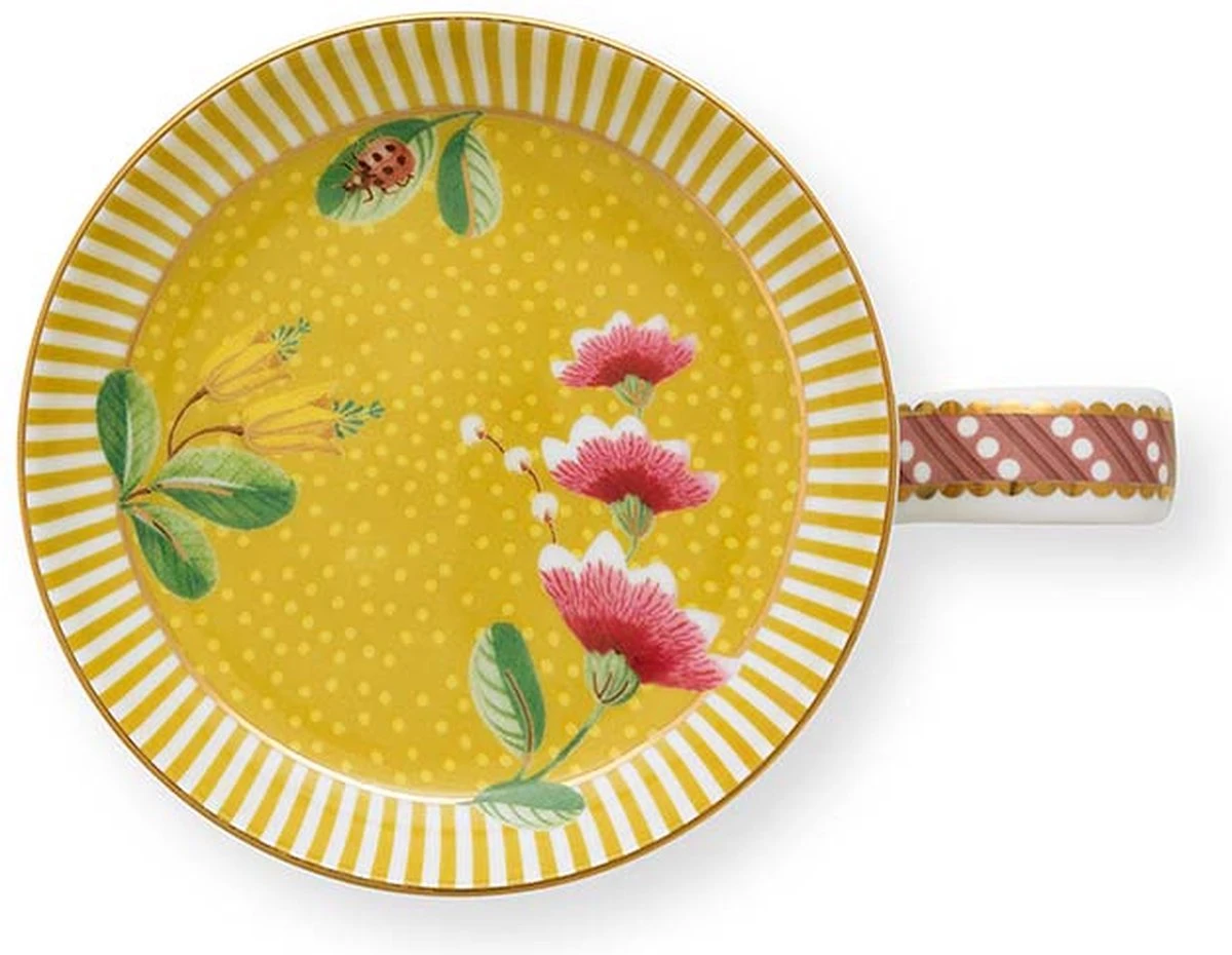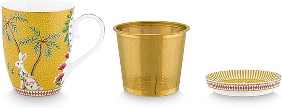 Een gele theeset bestaande uit een mok + theezeefje + theetip. De set is verpakt in een bijpassende doosje.