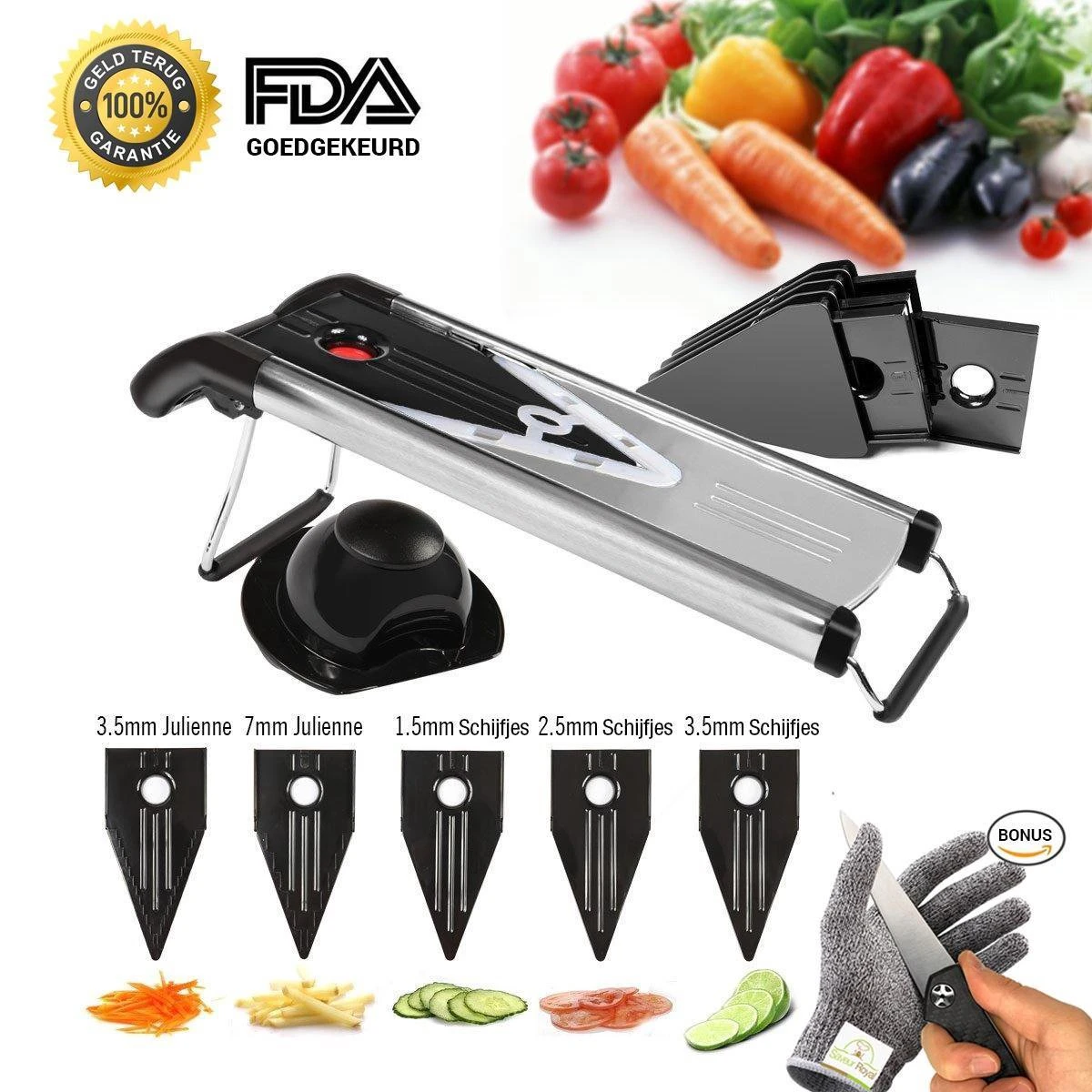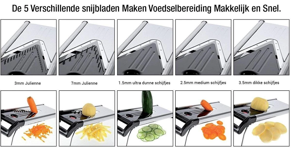 | Verpakkingsinhoud | 1 mandoline + 1 V-blad beschermer + 5 snijbladen + opbergcase + raspkop + snijbestendige handschoen |