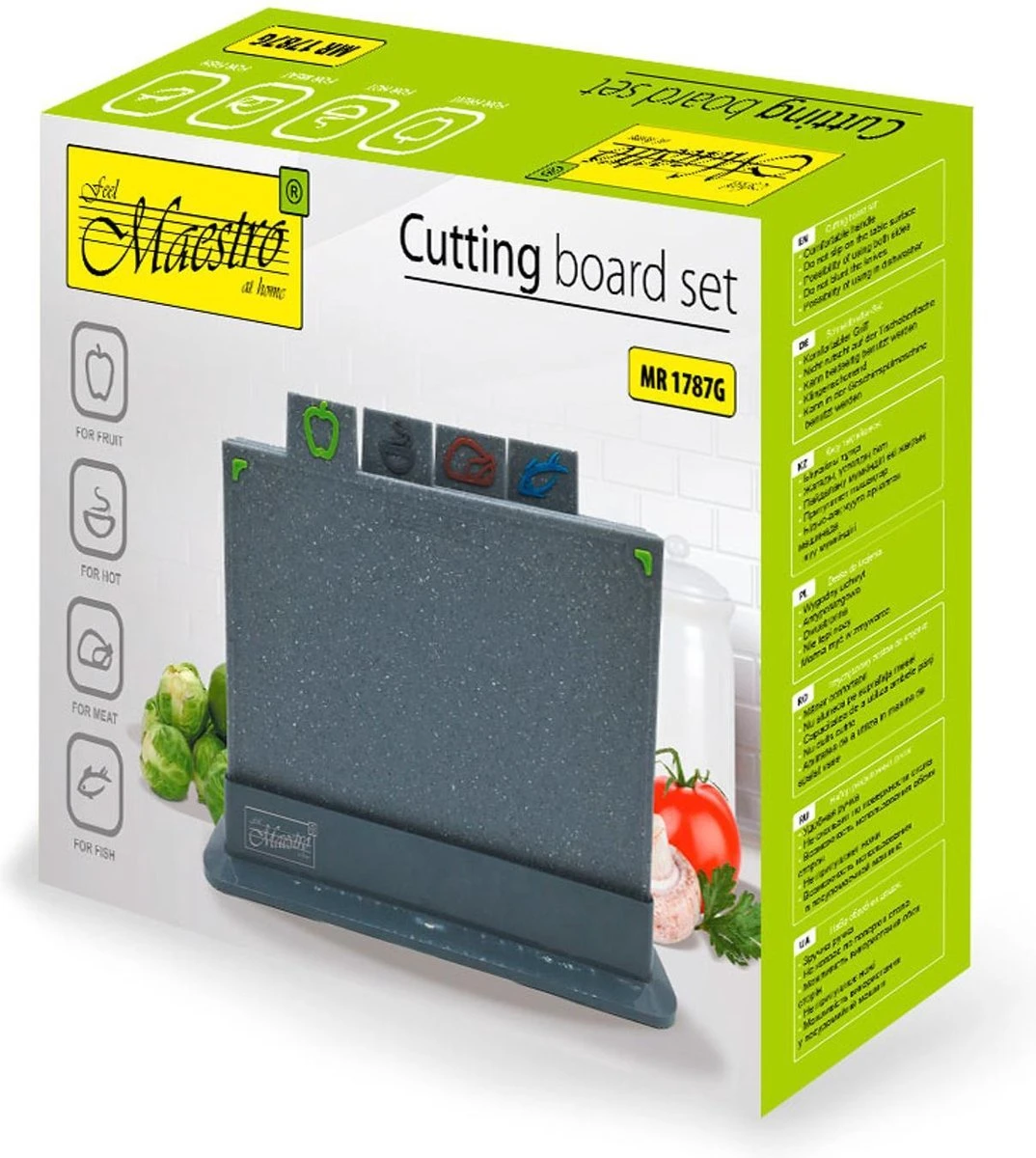 Een set van vier rechthoekige dubbelzijdige borden voor verschillende soorten producten. Zo kunt u voorkomen dat gesneden gerechten de smaak van ander voedsel overnemen!