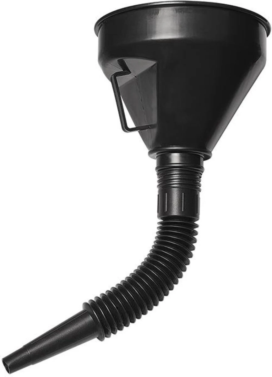 Stevige professionele plastic trechter met flexibele tuit en zeef, met name handig voor het bijvullen van vloeistoffen zoals brandstof en olie op moeilijk bereikbare plaatsen.