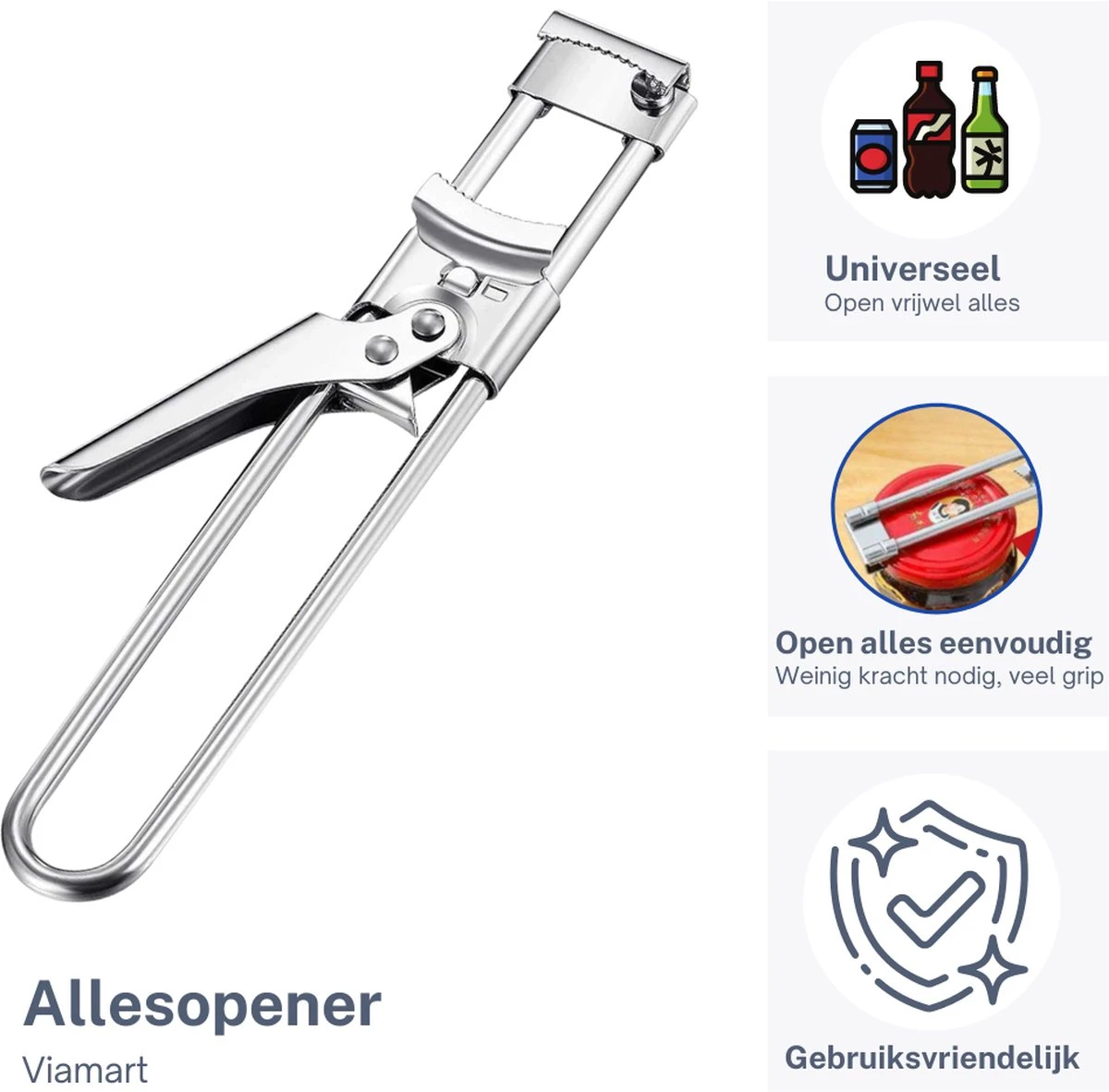 Met de Viamart Allesopener heb je altijd een handige tool binnen handbereik om potten, flessen, dopjes en deksels mee te openen. De allesopener is gemaakt van roestvrij staal (RVS) en is zeer eenvoudig in gebruik.