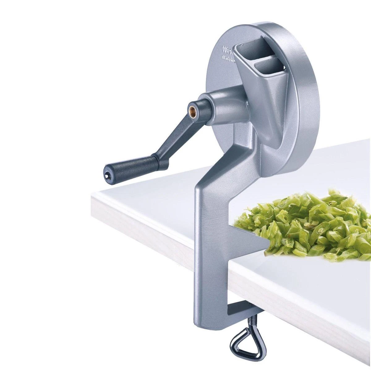 Een unieke hulp bij het snijden van bonen voor bijvoorbeeld een soep, een salade of als groentegerecht naast de bekende Hollandse aardappel. Deze handmatige bonensnijder van Westmark is zeer praktisch in gebruik. Het enige wat je hoeft te doen is je snijboon, sperzieboon of kousenband in de snijder te stoppen en vervolgens te gaan draaien aan het hendel. De bonen worden door de drie geharde en geslepen messen in mooie gelijkmatige stukken gesneden en zijn direct klaar voor bereiding. De stevige tafelschroefklem zorgt ervoor dat je stabiel kunt werken. Na gebruik is deze bonensnijder gemakkelijk schoon te maken met warm water en een sopje. De snijder is gemaakt van aluminium en heeft ultra scherpe RVS messen. De afmeting van deze bonensnijder is 12,3 x 14 x 26,5 cm.