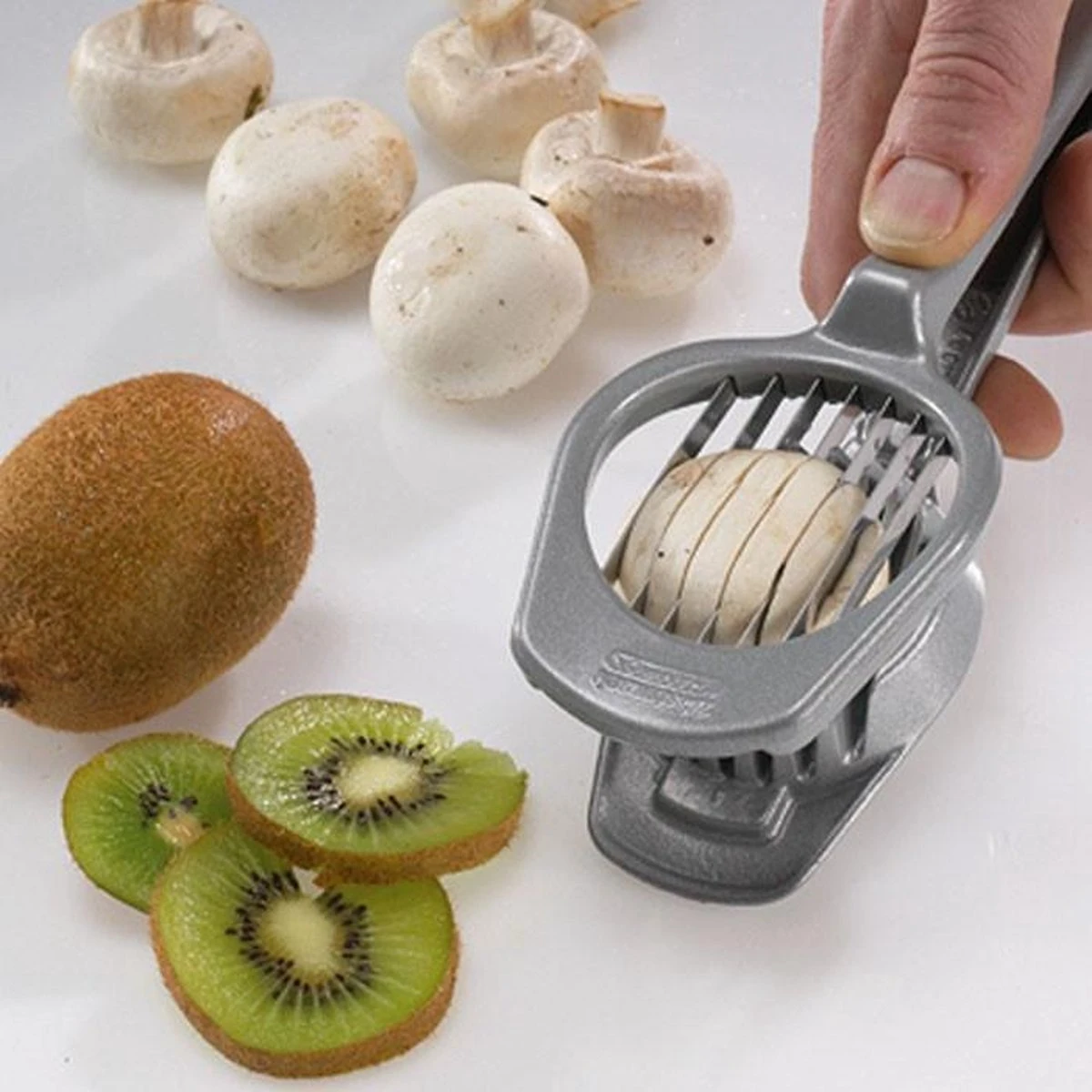 Deze zeer praktische Champion champignonsnijder in de vorm van een tang, is niet alleen perfect om champignons mee te snijden maar ook aardbeien, kiwi’s en andere vruchten zeer gemakkelijk in plakjes gesneden kunnen worden. De tang heeft een lengte van 19,5 cm en heeft 7 kleine roestvrijstalen snijbladen voor mooie, gelijkmatige schijfjes. Ideaal om snel te werken, niet alleen in de professionele, maar ook in de hobby keuken. Door zijn handige bediening ook een welkome keukenhulp voor ouderen en kinderen. Hij is gemaakt van gecoat aluminium en is eenvoudig te reinigen met warm water en een sopje.