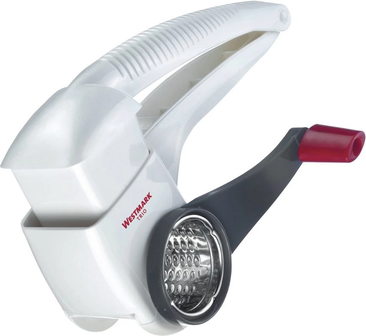 Het snijden van diverse soorten groente en noten doe je met deze Trio trommelrasp van Westmark. Deze handige trommelrasp heeft 3 verschillende trommels met diverse snijbladen. De extreem scherpe messen snijden door de meest harde groente- en notensoorten. Het apparaat is eenvoudig in gebruik. Plaats de gewenste trommelrasp in de houder en draai vervolgens aan de hendel. Het resultaat is een mooi gesneden groente of geraspte noten. En na gebruik reinig je de RVS snijbladen eenvoudig in de vaatwasmachine. De behuizing van de rasp is gemaakt van duurzaam kunststof is schoon te maken met een doekje. De afmeting van deze trommelrasp is 19 x 10,5 x 9,7 cm.